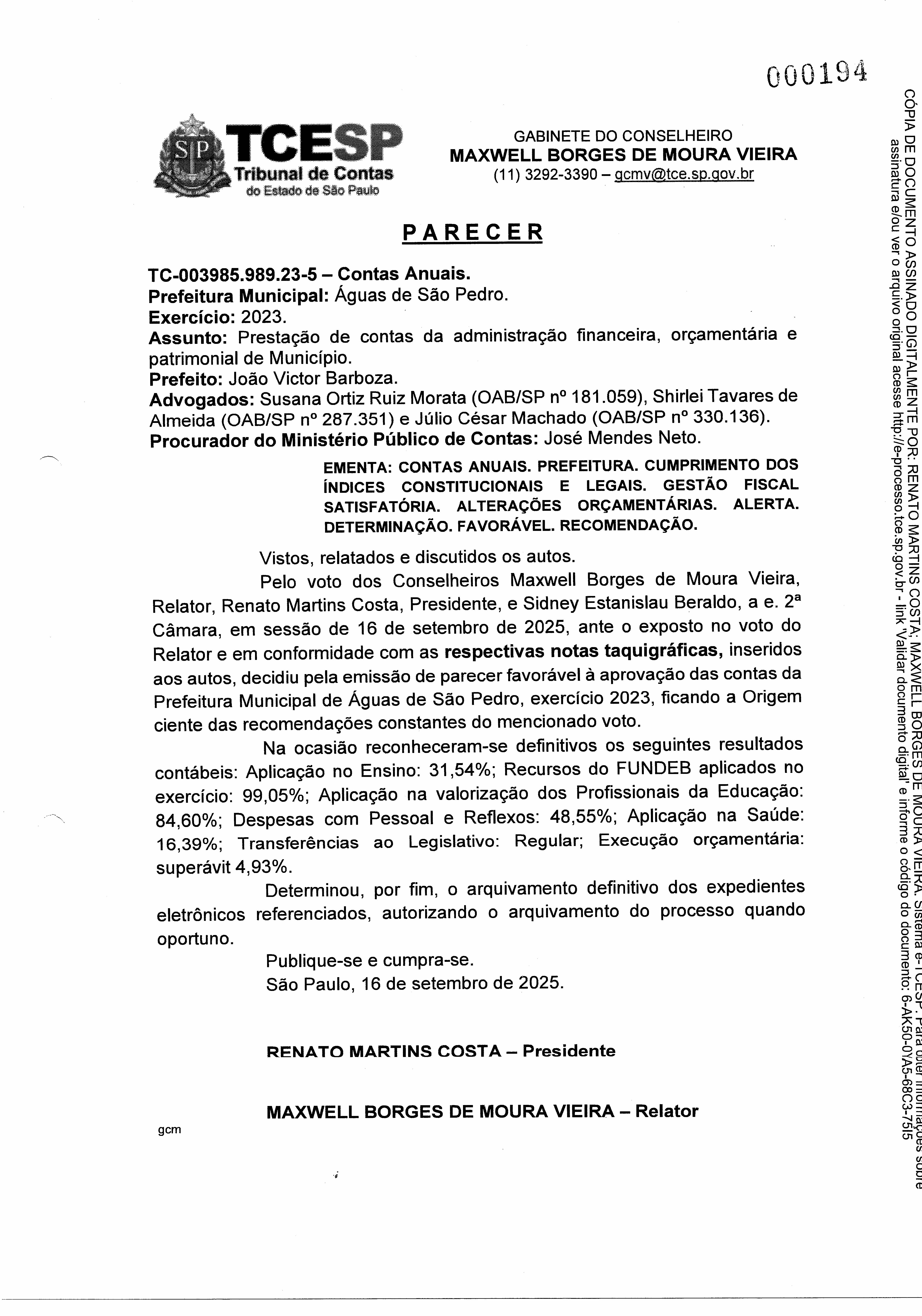 PARECER PRÉVIO DO TRIBUNAL DE CONTAS DO ESTADO DE SÃO PAULO - TC-003985.989.23-5 - CONTAS ANUAIS 2023